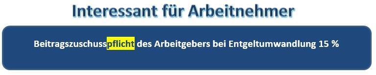 " Der Arbeitgeber muss 15 % des umgewandelten Entgelts zusätzlich als Arbeitgeberzuschuss an den Pensionsfonds, die Pensionskasse oder die Direktversicherung weiterleiten, soweit durch die Entgeltumwandlung Sozialversicherungsbeiträge einspart."