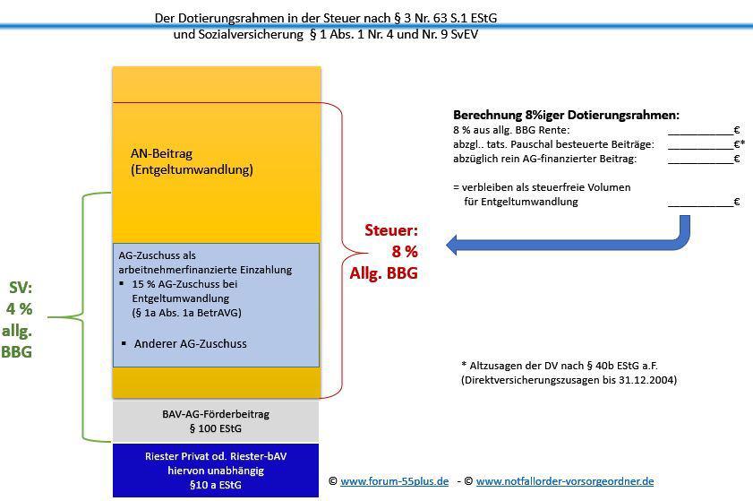 Der nach 3 Nr. 63 EStG geltende, steuerfreie Dotierungsrahmen der Beiträge wird von 4 % auf 8 % zur allgemeinen Beitragsbemessungsgrenze der Rentenversicherung (BBG) angehoben. Sozialversicherungsrechtlich verbleibt das Höchstkontingent bei 4 % zur Beitragsbemessungsgrenze (West).